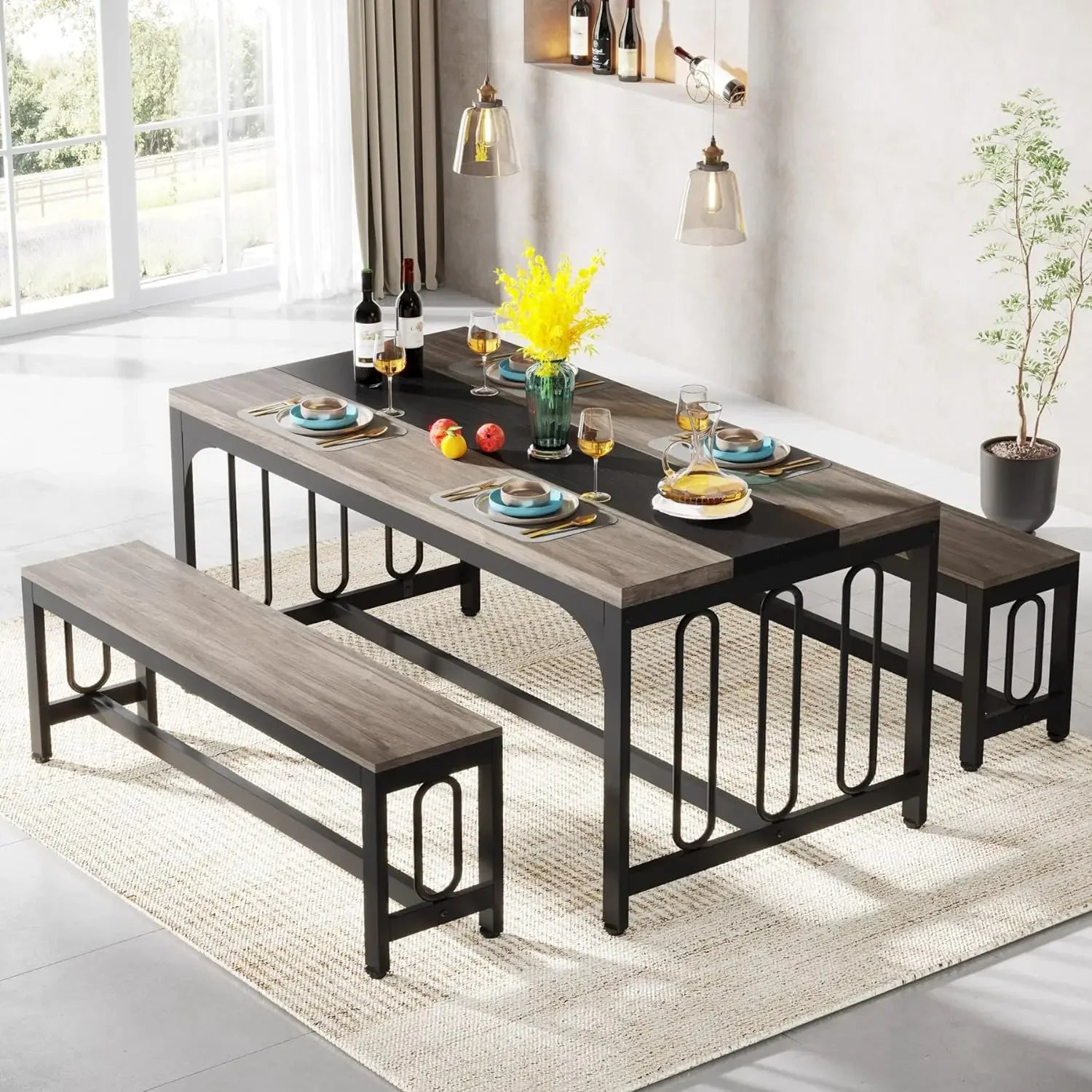 - 3 PIECE DINING TABLE SET: The size-wise black frame with rustic table set includes 1 rectangular table and 2 benches. This 3-piece dining table and chairs set comes complete with a spacious table(55" L x 27.5" D x 31.1" H) and 2 benches(47.2" W x 10.2" D x 18.5" H each).
