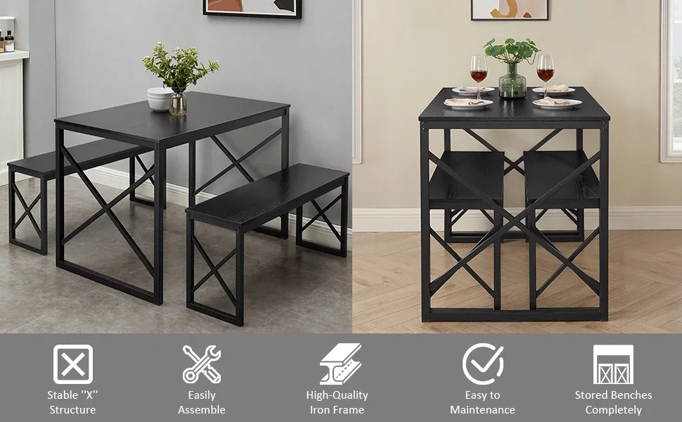 Made of a reinforced black metal frame, the set has good stability and large load-bearing, while each bench can hold up to 500 lbs, and the table can hold up to 300 lbs.